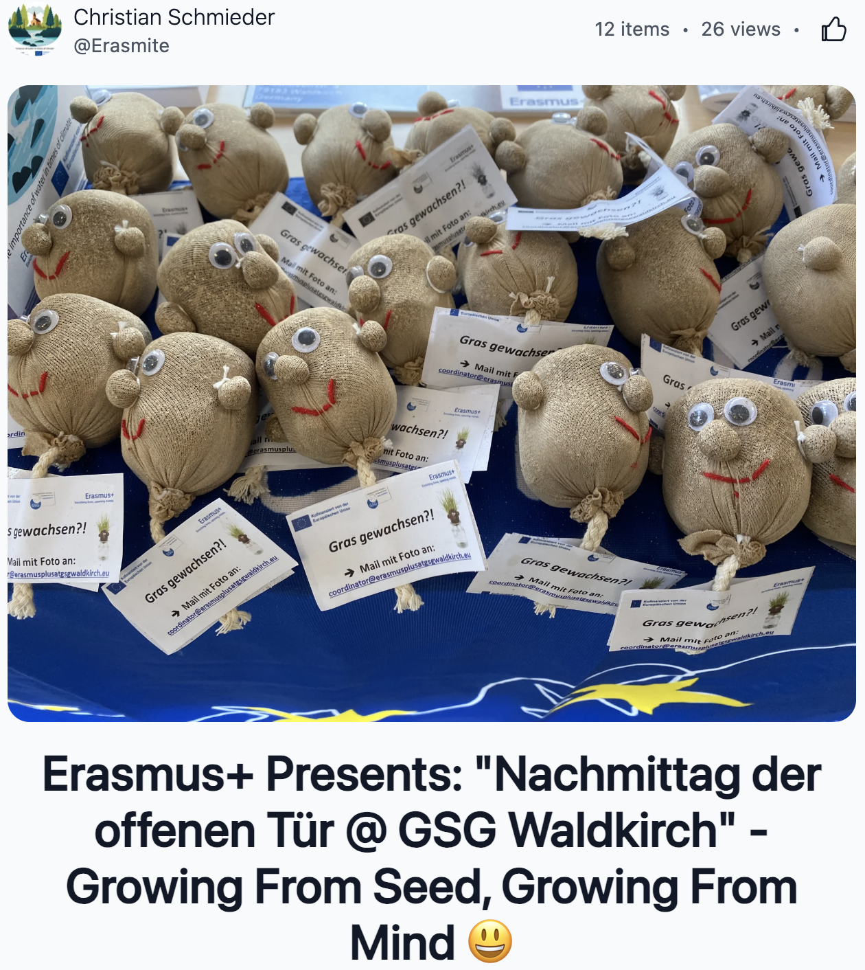 The “Erasmus+-Arbeitsgemeinschaft” presented its results on 14 February 2025. Another “Open Day” for grade 4 students interested become our new generation of grade 5 students. The guests took advantage of our “learning station” with our major results of the previews year. However, the most stunning give-away were the grass seeds. When watered regularly, the piece of cloth and seed will turn into a grassy-green head. Have a look at what we received from parents and students…